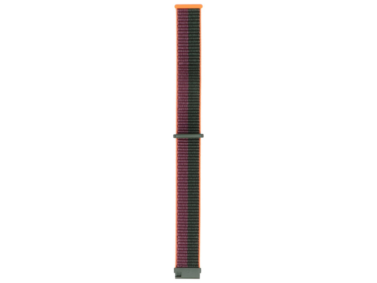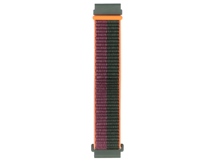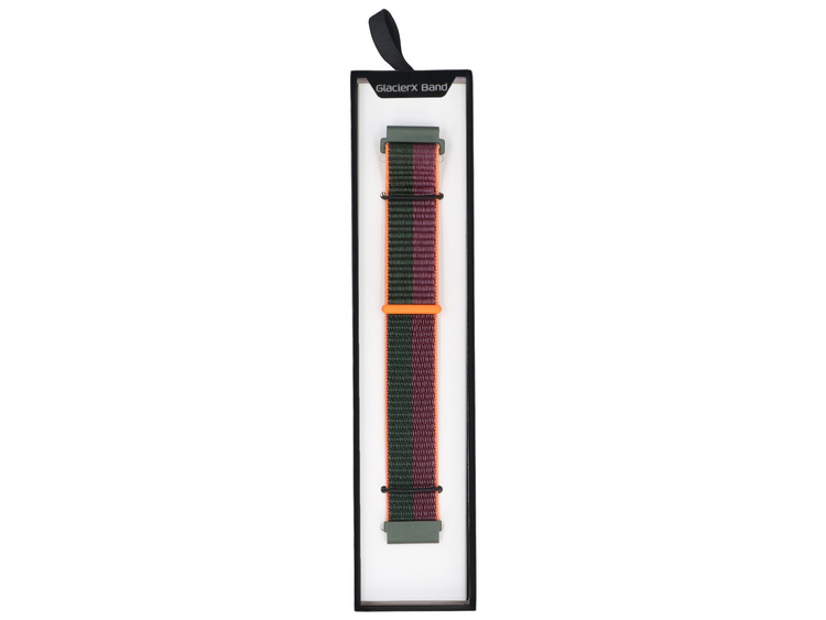 - Nylonarmband für die Smartwatch GlacierX in dunklen Grüntönen und Lila, mit kontrastierenden orangefarbenen Akzenten. Produkt neu, verpackt in der Originalverpackung. Breite 22 mm, mit Klettverschluss.