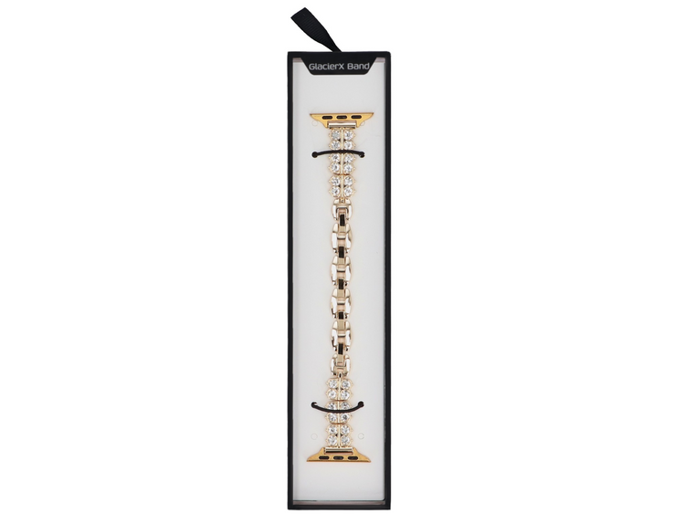- Die Gliederarmband GlacierX ist für die Apple Watch 38/40/41mm bestimmt. Farbe gold, verziert mit Zirkonia. Länge verstellbar durch vier abnehmbare Glieder. Produkt neu, verpackt in der Originalverpackung.