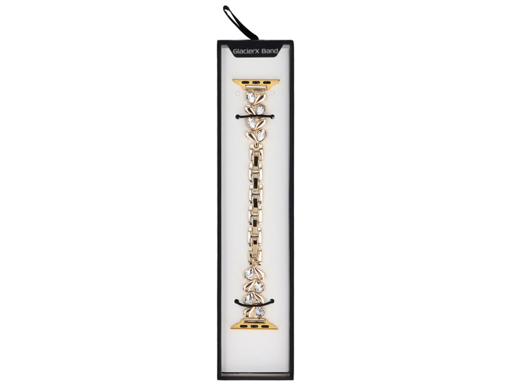 - Die Gliederarmband GlacierX ist für die Apple Watch 38/40/41mm bestimmt. Farbe Gold, verziert mit Zirkonia. Die Länge ist durch vier abnehmbare Glieder verstellbar. Das Produkt ist neu und in der Originalverpackung.