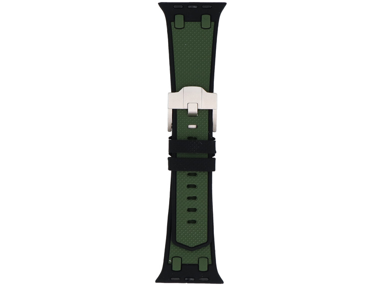 - Silikonarmband GlacierX, geeignet für Apple Watch 42/44/45/49mm, mit klassischer silberner Schnalle. Grün-grau, mit ausgeprägter, textiler Struktur.