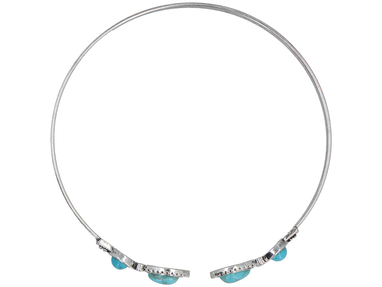 - Retro – steife Armreife im Vintage-Stil. Sie hat eine ovale Form, die für vergangene Jahrzehnte charakteristisch ist. Das zentrale Ornament besteht aus türkisfarbenen Steinen in Fassungen mit verzierten Rändern, die an das Handwerk früherer Juweliere erin