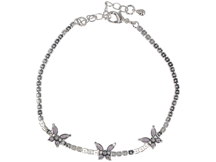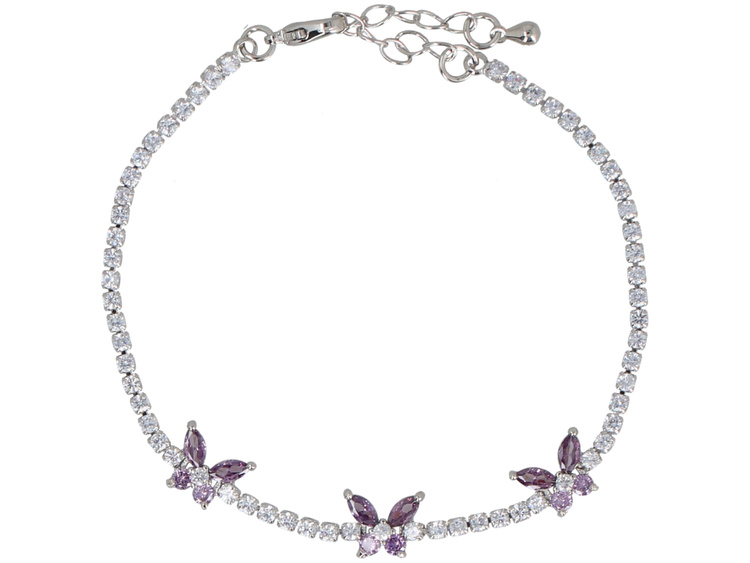 - Fabelhaft – ein Armband, das aus einer Reihe kleiner Zirkonia besteht, die eine subtile Linie des Glanzes bilden. Die Formen, die an rosa Schmetterlinge in der Mitte erinnern, verleihen ihm einen romantischen Charakter.