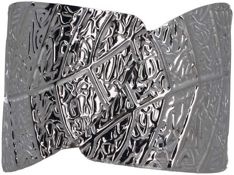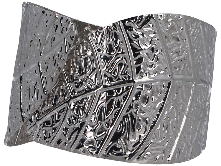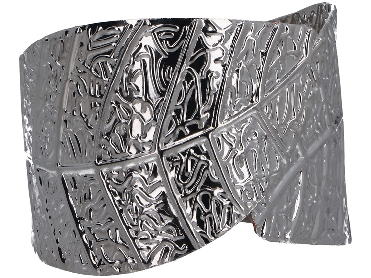 - Botanika - breite Armbanduhr in Silber, gefertigt aus strukturierten Segmenten, die ein effektives, geometrisches Blattmuster bilden. Die Oberfläche des Armbands hat eine raue, künstlerische Struktur.