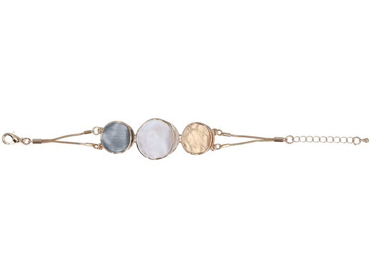 - Elegantes Armband in Gold- und Grautönen, verziert mit drei auffälligen, unregelmäßigen Elementen in einer Fassung, die an handgefertigten Kunstschmuck erinnert. Mit einem doppelten Kettenschluss und verstellbar für eine perfekte Passform.