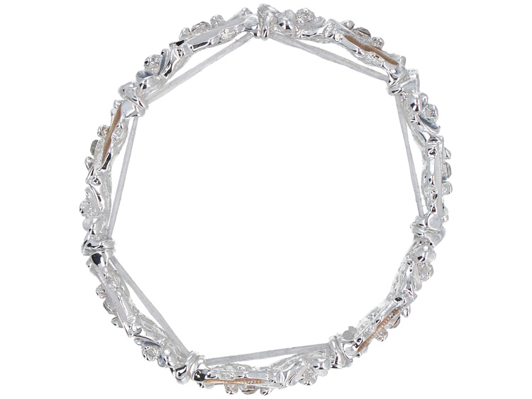 - Elastisches Armband in Silber, bestehend aus Segmenten in Form von Blumen und Schmetterlingen, mit gelb-blau-weißer Füllung im Emaille-Stil. Das ist ein charmantes und vielseitiges Accessoire, das jeder Stilistik Leichtigkeit und einen farblichen Akzent v