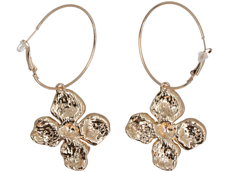 - Klee – goldfarbene Creolen mit einem auffälligen Anhänger in naturinspiriertem Design. Die unregelmäßige Textur reflektiert das Licht und erzeugt einen Effekt dezenten Glanzes.
