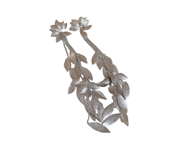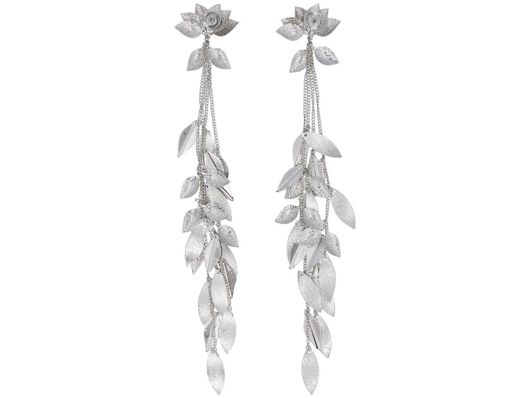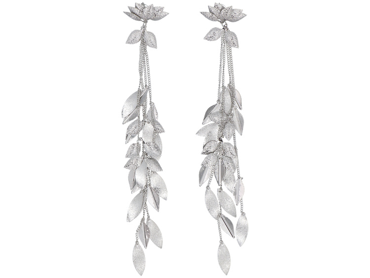 - Freude – lange Ohrringe in Silber, bestehend aus ovalen Blättern, die an Ketten hängen. Die kaskadierende Konstruktion verleiht ihnen Leichtigkeit und den Eindruck von Bewegung, während die strukturierte Oberfläche subtil glänzt und das Licht ungleichmäßi