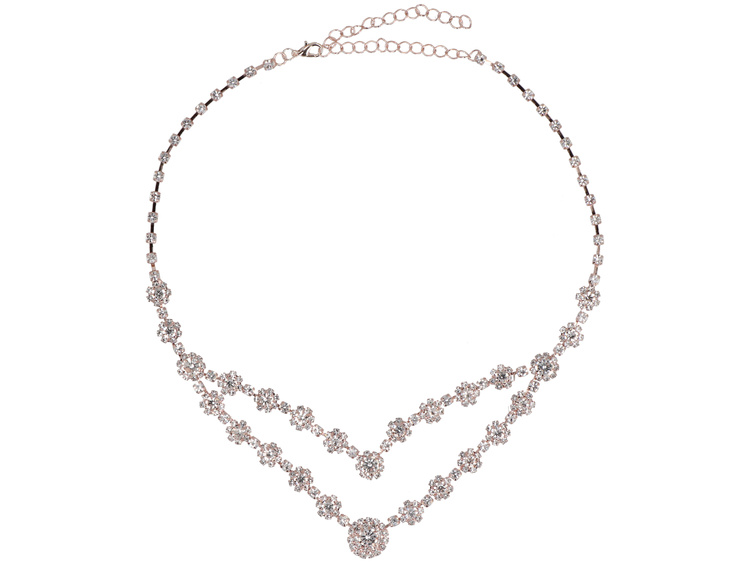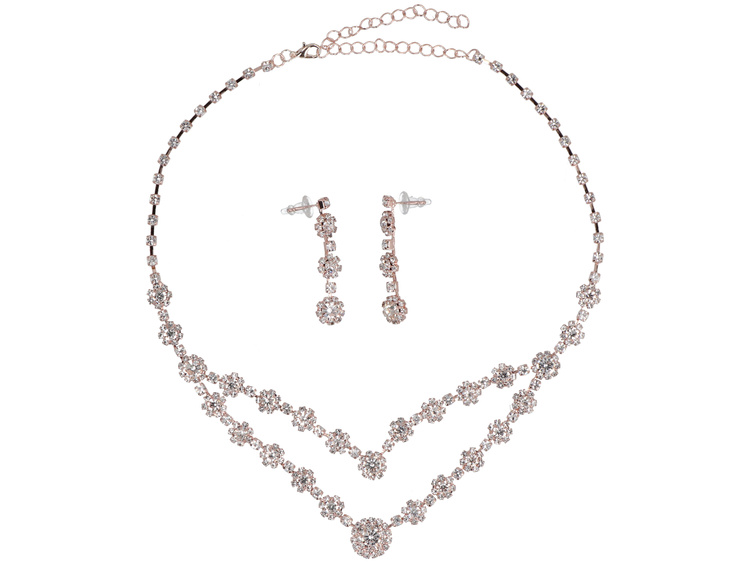 - Schmuckset in Roségold. Eine mehrschichtige Halskette und Ohrstecker, verziert mit glänzenden Zirkonia, die in Rosetten angeordnet sind und an kleine Blumen erinnern. Ein Set, das dem Outfit Eleganz in romantischer Ausführung verleiht.