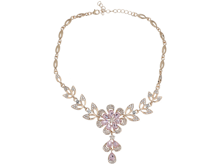 - Ein Schmuckset, in dem Fantasie auf Eleganz trifft. Die Halskette beeindruckt mit einer kunstvollen Komposition von Elementen, die in Form von Blättern angeordnet sind und zu einem zentralen Punkt führen – einem großen, blumigen Motiv. Ergänzt wird das Se