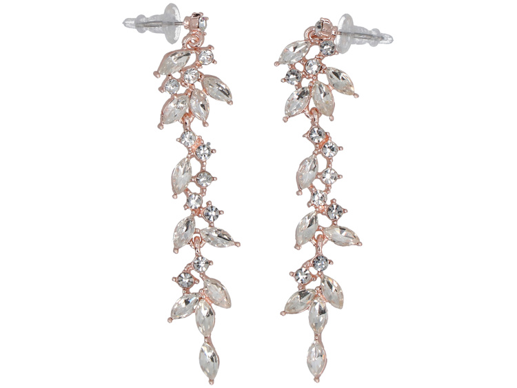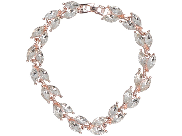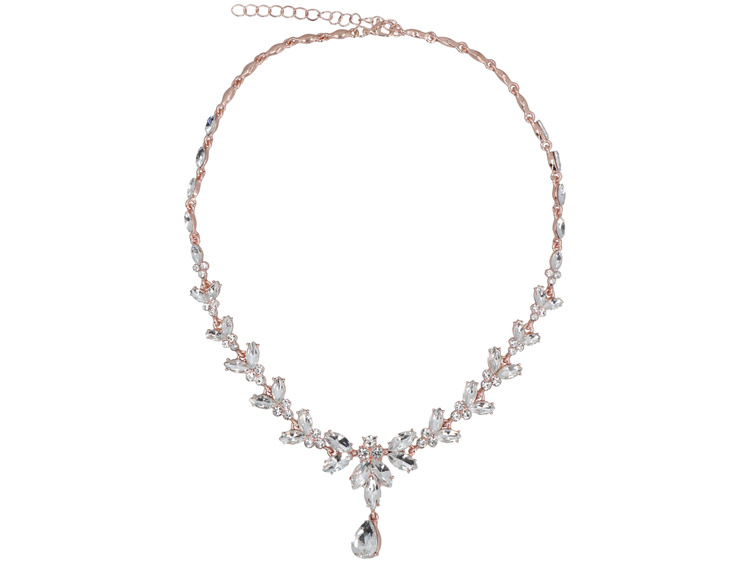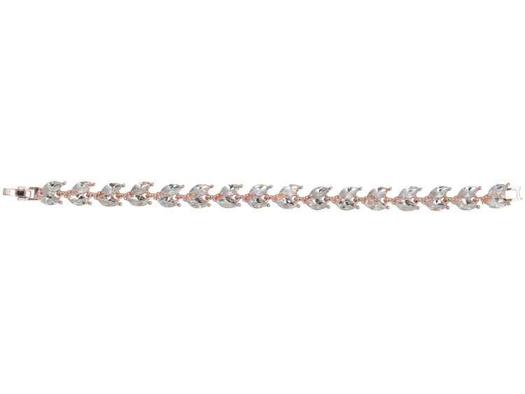 - Schmuckset in Roségold. Eine Halskette, ein Armband und Ohrstecker, verziert mit glänzenden Zirkonien, die in einem von der Natur inspirierten Muster angeordnet sind. Ein reichhaltiges Set für besondere Anlässe, in einem eleganten und romantischen Design.
